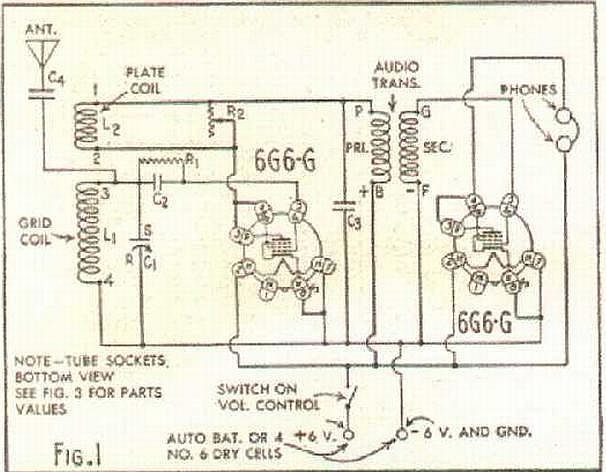Der 1937 in der Dezember-Ausgabe vorgestellte Bauvorschlag für einen „Two-Tube Portable Emergency Receiver“ [3] arbeitet mit zwei Batterietrioden vom US-Typ 30 (Bilder 2 und 3). Es handelt sich um die übliche Leithäuser/Schnell-Schaltung, an die die NF-Stufe über einen Übertrager angekoppelt ist. Die Rückkopplung wird durch Verschieben einer Spule über der Schwingkreisspule eingestellt. Offensichtlich ist dieses Gerät für den Empfang nur einer lokalen Station konzipiert.