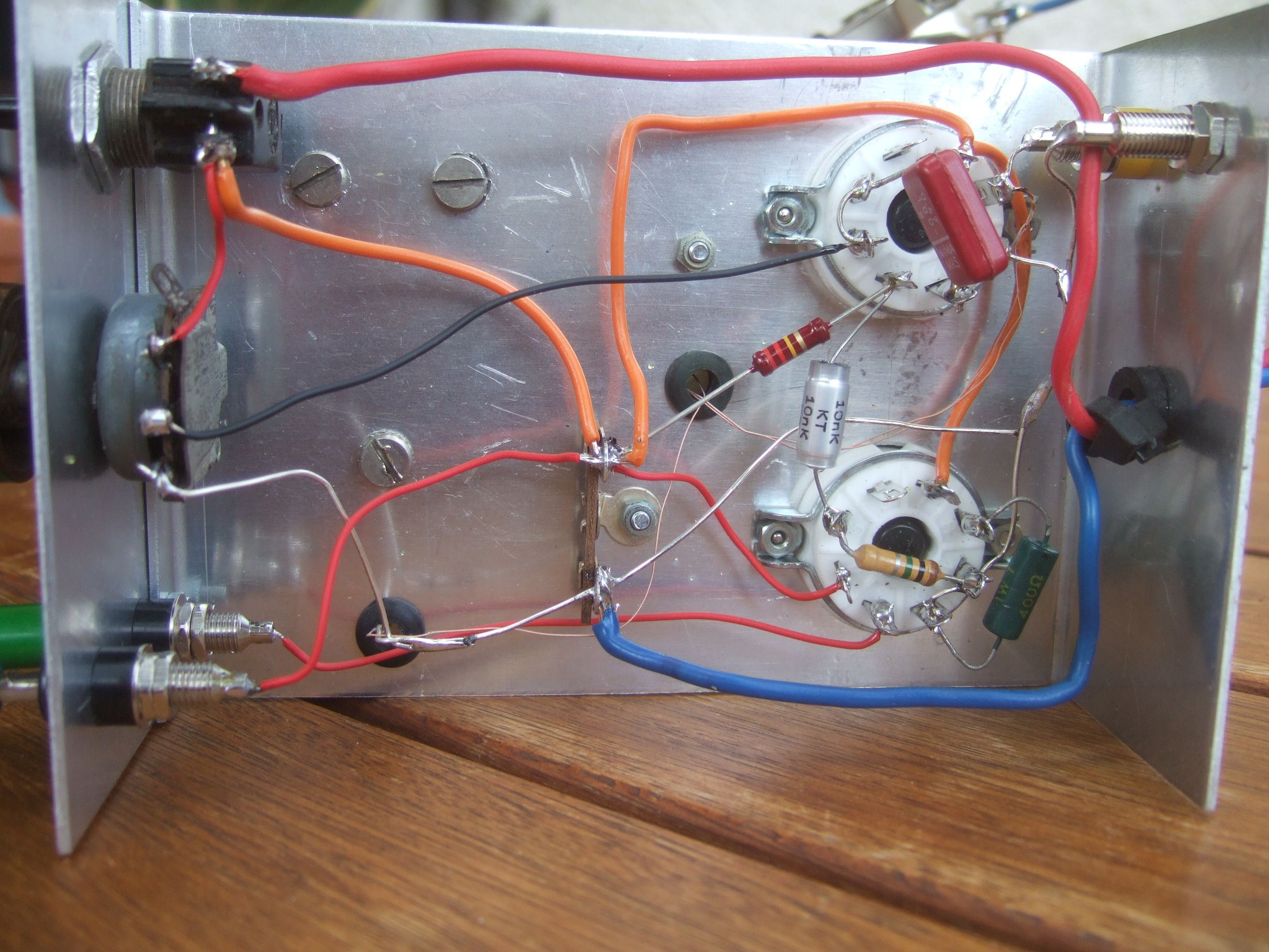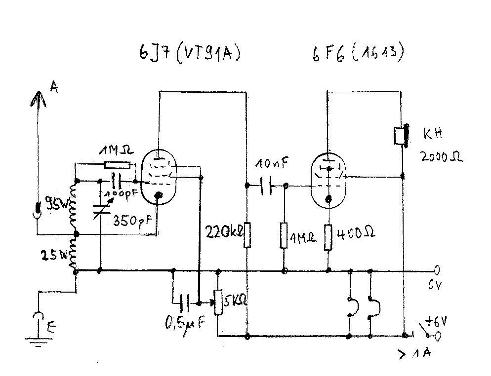 Das Chassis wurde aus vorhandenen Aluminiumblechen ungefähr mit den Maßen angefertigt, die im Bauvorschlag angegeben sind. Die Anordnung der Bauteile ist gleich, lediglich die Kopfhörerbuchsen wurden praktischerweise nach vorne verlegt. Als Röhren standen eine VT91A, die der 6J7G entspricht, und eine 1613, die der 6F6 entspricht, zur Verfügung. Spulenkörper ist ein Stück einer Pappröhre (ehemaliger Kern einer Thermo-Faxpapier-Rolle) mit 30 mm Durchmesser. Darauf befinden sich 120 Windungen seideumspannter CuL-Draht, Kathoden-Anzapfung bei 25 Windungen. Die wenigen weiteren Teile sind Standardbauelemente, an die keine besonderen Ansprüche bezüglich Leistung und Spannungsfestigkeit gestellt werden.